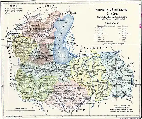 Sopron county shared borders with the Austrian land Lower Austria and the Hungarian counties Moson, Győr, Veszprém and Vas. The Lake Neusiedl (Hungarian: Fertő tó, German: Neusiedler See) lay in the county. Its area was about 3,256 km2 around 1910.