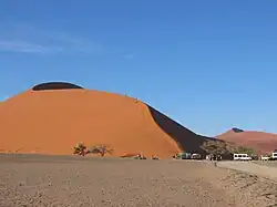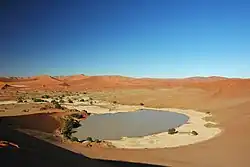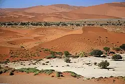 Sossusvlei (sometimes written Sossus Vlei) is a salt and clay pan[1] surrounded by high red dunes, located in the southern part of the Namib Desert, in the Namib-Naukluft National Park of Namibia. The name "Sossusvlei" is often used in an extended meaning to refer to the surrounding area (including other neighbouring vleis such as Deadvlei and other high dunes). These landmarks are some of the major visitor attractions of Namibia.[2]