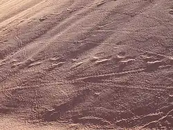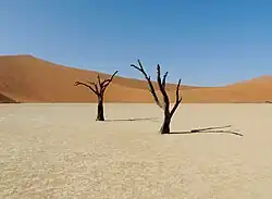 Sossusvlei is about 66 km past the Sesriem gate. The last 6 km can only be traversed with 4WD vehicles as the metalled road ends and sand begins (the place where the metalled road ends is known as "2x4 parking" as any non-4WD vehicle must stop there). Sossusvlei is a clay pan, of roughly elliptical shape, covered in a crust of salt-rich sand.[1] While the pan has been shaped over time by the Tsauchab river, the actual flooding of the pan is a relatively rare event, and sometimes several years pass between one flood and the next one. The river is dry most of the year, and even when it is not, it carries relatively little water to the vlei. The vlei is surrounded by high orange-reddish dunes, partially covered by a vegetation comprising grass, bushes, and some trees (mostly of species Vachellia erioloba).
