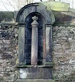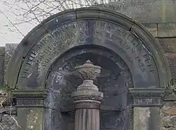 The inscription on the pediment above the alcove in which the replacement 'cross' stands reads "To the memory of Lord Soulis, A.D. 1444. Erected by subscription, A.D. 1825. The days of old to mind I call."[8][9]