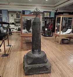 Originally the shaft may have been topped by a stone cross that has been lost, an iron cross being added in the 19th century, a replica of which was made when it was restored for display in the museum.[3] The top level of the base has a couple of holes that suggest that something metallic was once inserted such as a chain.