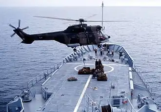 With the retirement of SAS Outeniqua in 2004, SAS Drakensberg is the sole fleet replenishment ship with the primary role of supporting combat vessels at sea.[52] Drakensberg is also modified to carry two RHIBs, as well as two landing craft utility (LCU) for limited amphibious use. Since the end of minority rule, Drakensberg has undertaken numerous humanitarian and anti-piracy operations, consistently shown the 'rainbow flag' on global voyages of goodwill, and reintegrated South Africa back into international naval exercises.[53]