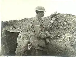 In early 1916, the decision was made to transfer part of the AIF to Europe to take part in the fighting in the trenches along the Western Front in France and Belgium.[6][15] Still attached to the 7th Brigade, the 27th Battalion entered the front-line for the first time on 7 April 1916 as the Australians took over a quiet sector near Armentières. On 8 July 1916, the 7th Brigade was ordered to march to the Somme to support the Australian 1st Division which was taking part in the fighting around Pozières.[16] On 28 July, the 7th Brigade undertook an attack on the German line, however, during this time the 27th Battalion was held back in reserve.[17] The attack proved unsuccessful and as a result it was ordered to launch a second attack on 4 August, centred upon German positions around Bapaume.[18]