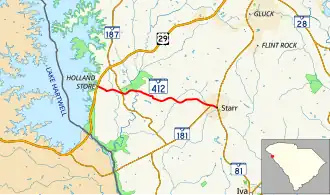 South Carolina Highway 412 (SC 412) is a 7.030-mile (11.314 km) state highway in the U.S. state of South Carolina. The highway connects rural areas of Anderson County with Starr.