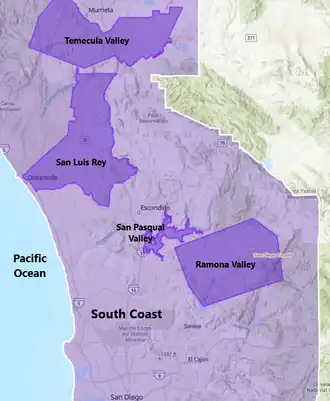 | Sub-regions | Ramona Valley AVA, San Luis Rey AVA, San Pasqual Valley AVA, Temecula Valley AVA |