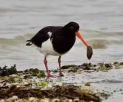 It mostly feeds on mollusks and worms.[4] A major food source for oystercatchers is the New Zealand cockle, Austrovenus stutchburyi. It is estimated that an individual oystercatcher can eat around 200,000 cockles in a single year.[5]