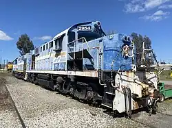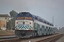 - Coaster #2105 is a F40PHM-2C built in 1994 by Morrison–Knudsen for commuter rail service for the then new Coaster commuter rail in San Diego. It hauled commuter trains for the next 25 years until being retired in 2021 and replaced with a Siemens SC-44 Charger. With the help of Mike Armstrong of the CoasterFan2105 YouTube Channel, 2105 was donated to the Southern California Railway Museum in 2022. The locomotive was moved to BNSF Railway's Commerce rail facility yard later that year. It is currently in storage, awaiting alongside SD45-2 #5704 for the "Perris Connection" to be reconnected. The locomotive is currently inoperable as a hole was drilled in the engine as per Tier 4 Regulation standards to ensure the locomotive cannot operate again. The museum hopes once it arrives at the museum, it can be operated as a cab car on their short stretch of line.[28] However, as of 2024, just like Santa Fe #5704, it has yet to arrive at the museum and stored at the BNSF Railway Commerce Yard. Just like Santa Fe #5704, 2105 is expected to arrive at the museum in early May 2025 due to the completion of the "Perris Connection". Along with 5704, this locomotive arrived on museum property on May 3, 2025.