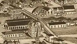 The railroad's impact on Knoxville's development was swift. The city's population more than doubled from just over 2,000 in 1850 to over 4,000 in 1860.[6] After the war, the city's wholesaling sector expanded rapidly. By the early 1870s, the Knoxville wholesaling firm, Cowan, McClung and Company, was Tennessee's most profitable company.[7] The railroad also brought heavy industry to the city, such as the Knoxville Iron Company, Knoxville Woolen Mills, and Brookside Mills.[8] The railroad aided the rise the Tennessee marble industry, with eleven quarries in operation in Knox County alone by 1882.[4]