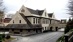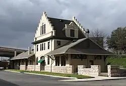 The passenger terminal station and express depot, both designed in the same vernacular style with Classical Revival influence, were completed in 1903 and 1907, respectively,[2] and are notable for their signature corbel-stepped gabled roofs. The terminal building is two-and-a-half stories, with the lower level originally containing the dining rooms, baggage check, express and mail rooms, and the upper level originally housing the ticketing and waiting rooms. A bridge connects the upper level with Depot Avenue. The building originally included a clock tower, which was removed in 1945, apparently due to structural problems.