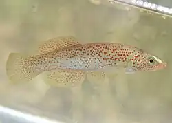 The southern studfish is 2.2 to 3.9 inches (5.6 to 9.9 cm) long.[3] The male has elongated posterior dorsal fin rays that may extend to the base of the caudal fin.[4]: 322–324 The dorsal fin in both sexes begins almost directly above the anal fin, with 12–13 rays present in each.[4]: 323 The coloration of the breeding male is striking, with distinct orange spots irregularly speckling the entire body and extending to the head and fin bases.[3][4]: 322–324 The body color may be iridescent blue, with gold appearance in the vicinity of the opercula.[3][4]: 322–324 A variable black margin[3] may be present on the pale[4] dorsal and caudal fins, and they, with the anal, also bear orange spots.[3][4]: 322–324