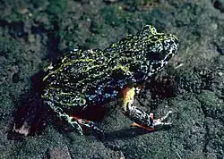 The species grows to about 20–30 mm in length (SVL). The upper body is dark brown to olive green, with black warty blotches. The underparts, which are smooth in females and granular in males, are very distinctively marked, being mainly yellow, orange or red in colour with a broad band of black and white, or black and blue, marbling that covers the chest and upper belly. The toes are unwebbed.[1]