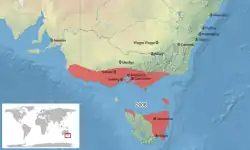 The westernmost part of the species’ range is in the extreme south-east of South Australia, extending across southern Victoria, mainly south of the Great Dividing Range, to Flinders Island and northern and eastern Tasmania. The frogs are found in damp areas at lower elevations in grasslands, heathlands, woodlands and forests where they shelter beneath rocks, logs and leaf litter.[1]