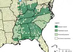The southern two-lined salamander is found in the Southeast United States except for peninsular Florida.[9]