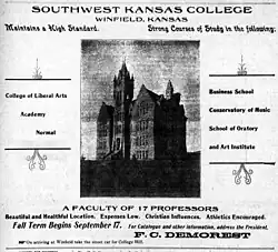 - ^ a b c d "Southwest Kansas College," Wichita Daily Eagle, vol. 1, no. 122 (Oct. 4, 1884), pg. 4.