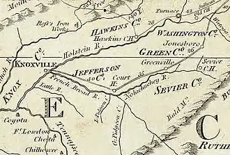 The Washington District initially included lands north of the French Broad River and northeast of the confluence of the Clinch and Tennessee rivers (near modern Kingston). The 1791 Treaty of Holston pushed the boundary south of the French Broad and southeast to the divide between Little River and the Little Tennessee River (in what is now southern Blount County). The Washington District originally included Washington, Sullivan, Greene and Hawkins counties.[1] Knox and Jefferson were created by Governor Blount in 1792.[15] In 1793, Blount organized these two new counties into a separate district, called the "Hamilton District".[19] Blount and Sevier counties would be added to this new district during territorial administration.[15]