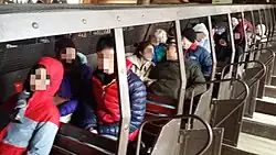 The Sovereign Hill mine tram, opened in March 2008, is an inclined tramway that takes tourists into the mine for a tour.[4] Each tram is 1.35 metres wide and 1.55 metres high, and can carry 33 passengers. The tram goes through a flap, and enters a dark tunnel.[5]