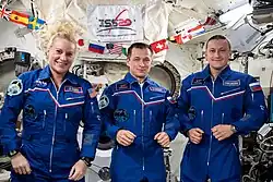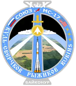 ![]() Mission patch ![]() From left: Rubins, Ryzhikov and Kud‑Sverchkov | |