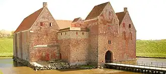 The estate was transferred to the Diocese of Viborg in 1404. It became the property of the Crown in 1536 and was sold to Henrik Below (1540–1606), a nobleman with the Danish court. The oldest section of the building is the south wing, which was constructed c. 1521. The east and north wings followed between 1525 and 1530. The western end of the north wing was destroyed by an incoming tidal wave in 1534. The large arched windows were walled up, leaving only narrow sighting slits. The oldest part of the building is the cellar with cross vaults supported by pillars.[2] The ramparts and the double moat served to defend the castle from cannon fire.[3]