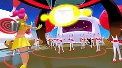 The game is split between the story mode, a training mode, and a 100-stage endurance mode.[4] Including the tutorial, there are five stages in the story campaign.[5] As with previous entries, gameplay focuses on mimicking the movements and vocalisations of opponents (compared by journalists to the game Simon Says).[6][7] Players perform actions by physically moving their body in time to instructions.[6][8] Actions are performed in time to music tracks playing in each section of a stage.[6] Character actions carried over from the original games are up, down, left, right and actions accompanied by the vocalization "Chu".[6][3] Two New actions are "Pose", where the player must match the enemy's body pose, and "Barrier", where players summon a special shield to protect themselves.[9]