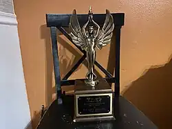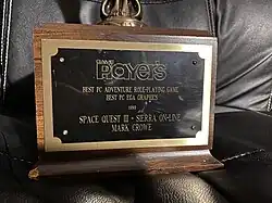 Close up of the Plaque of the Game Player's award for Best PC EGA Graphics -1989. Presented to Mark Crowe