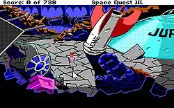 A scene from the garbage freighter, showing some typical Space Quest science fiction allusions: wrecks of a TIE fighter, an ACME Rocket, and the Jupiter 2 spacecraft.