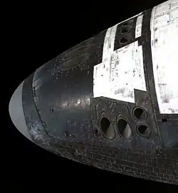 The orbiters were protected by Thermal Protection System (TPS) materials (developed by Rockwell Space Systems) inside and out, from the orbiter's outer surface to the payload bay.[17][18] The TPS protected it from the cold soak of −121 °C (−186 °F) in space to the 1,649 °C (3,000 °F) heat of re-entry. The tile materials comprising much of the orbiter's outermost layer were mostly air held within near-pure silica fibers, which made it efficient at refractory insulation that absorbed and redirected heat back out into the air, and covered in silicon borides and borosilicate glass, with blacker tiles covering the lower surface, and whiter tiles covering the tail, parts of the upper wing and crew cabin surfaces, and the outsides of the payload bay doors. The nose cap, nose landing gear doors, and leading edges were made of reinforced carbon–carbon, which is rayon impregnated with graphite-filled resins and coated in silicon carbide.[19] The upper, white materials that were not in tiles were mostly made of either Nomex felt coated in silicon-rich elastomer or beta cloth, woven silica fibers covered in Teflon. This was especially true in the interior of the payload bay.[20][21][22][18]