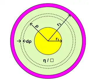 In the case of a coaxial cable, there is a closed-form solution. The resistive surface is considered to be a series of infinitesimal annular rings, each having a width of dρ and a resistance of (η/2πρ)dρ. The resistance between the inner electrode and the outer electrode is just the integral over all such rings.