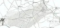 In the Battle of Messines (7–14 June 1917), a major attack on Spanbroekmolen and the neighbouring strongpoints Peckham and Kruisstraat was planned by the British. It was known that, due to its importance, the Germans intended to hold the hill at Spanbroekmolen at all costs (unbedingtes Halten).[2] In order to break the heavily armed positions, the British employed tunnelling companies of the Royal Engineers with the aim of placing a series of mines beneath the German lines on the Messines Ridge. The start point for the Spanbroekmolen mine gallery was in the area of a small wood some 270 metres (300 yd) to the south-west of the hamlet. In December 1915, 250th Tunnelling Company dug a 18 metres (60 ft) shaft and then handed over the work to 3rd Canadian Tunnelling Company in January 1916. Other operating changes – including a brief tenure of 175th Tunnelling Company at Spanbroekmolen in April 1916[3] – occurred until 171st Tunnelling Company took over and extended the work to the German lines, driving the tunnel forward for seven months[4] until it was beneath the powerful German position. The mine chamber was set 27 metres (88 ft) below ground, at the end of a gallery 521 metres (1,709 ft) long.[5] At the end of June 1916 the charge of 41,000 kilograms (91,000 lb) of ammonal in 1,820 waterproof tins was complete, the largest yet laid by the British. With the mine complete, the British selected two additional objectives to be attacked near Spanbroekmolen, Rag Point and Hop Point, which were 820 metres (2,700 ft) and 1,100 metres (3,500 ft) from the main tunnel. A branch was started and inclined down to 37 metres (120 ft) depth. By mid-February 1917 the branch had been driven 350 metres (1,140 ft) and passed the German lines.[6] At that point, the German counter mining activities damaged 150 metres (500 ft) of the branch gallery and some of the main tunnel. The British decided to abandon the branch gallery because aggressive counter-mining would likely have alerted the Germans to the presence of a deep-mining scheme. On 3 March 1917, the Germans blew the main tunnel with a heavy charge laid from their Ewald shaft, leaving it beyond repair and resulting in the 41,000-kilogram (91,000 lb) explosive charge being cut off for three months.[6] The British started a new gallery alongside the old main tunnel which after 357 metres (1,172 ft) cut into the original workings. Mining was greatly hampered by the influx of gas, several miners being overcome by the fumes, but eventually – and only a few hours before Zero Hour – the main charge was ready again and secured by 120 metres (400 ft) of tamping with sandbags and a primer charge of 450 kilograms (1,000 lb) of dynamite.[4] Although tested fully just a few hours before the attack, officers used torch batteries to prove the circuits.[7] The mines at Messines were detonated at 3:10 a.m. on 7 June 1917. The Spanbroekmolen mine exploded 15 seconds late, by which time soldiers of the 36th (Ulster) Division had already been ordered to go over the top, had left their trenches and begun to move across no-man's land. In addition to obliterating the German fortifications, falling debris from the blast also killed a number of British soldiers, some of whom are buried at Lone Tree CWGC Cemetery nearby.[4] The crater formed by the blast was approximately 76 metres (250 ft) in diameter, and 12 metres (40 ft) deep.[7]