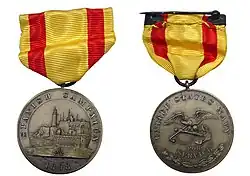 Early versions of the Spanish Campaign Medal suspended the medal from a gold and red ribbon, but this design was changed in 1913 upon request from Spain that a United States service medal not bear the colors of the Spanish nation.[5] The new medal was suspended from a blue and yellow ribbon. Separate medallions existed for both the Navy and Army. Marine Corps recipients received the Navy version with the seal of the United States Marine Corps on the reverse of the medal.