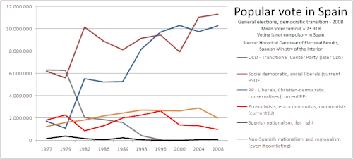 After 36 years of theoconservative National-Catholic Francoism, Spanish society as a whole has consistently shown a secular, left-leaning trend. Over a period of 40 years of liberal democracy, the social democratic Spanish Socialist Workers' Party (PSOE) spent 21 years in office, although the conservative People's Party (PP) has since then steadily grown and has recently governed for eight years. Large regions as Andalusia or Extremadura have had PSOE regional governments since democracy was re-established in the country. Ecosocialist-Eurocommunist United Left has traditionally been the distant fourth political force in Spain, and recently has further lost some of its presence and representation. As a result of the overexploitation of national symbols and references by the Francoist regime, patriotism is not ingrained in Spanish society. Nationalisms and regionalisms are strong in spite of the high decentralization of the Spanish state, especially in Catalonia and in the Basque country.