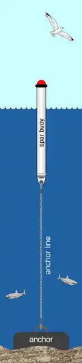 A spar buoy is a tall, thin buoy that floats upright in the water and is characterized by a small water plane area and a large mass. Because they tend to be stable ocean platforms, spar buoys are popular for making oceanographic measurements. Adjustment of the water plane area and the mass allows spar buoys to be tuned so they tend to not respond to wave forcing.[1] This characteristic differentiates them from large water plane area buoys[2] such as discus buoys that tend to be wave followers. Spar buoys are often used as stable platforms for wave measurement devices[3] and air–sea interaction measurements.[4] Spar buoys range in length from around one metre[5] to the 108-metre (354-foot) RP FLIP. To avoid the difficulties inherent with shipboard launch and recovery, helicopter deployment of large spar buoys has been studied.[6]