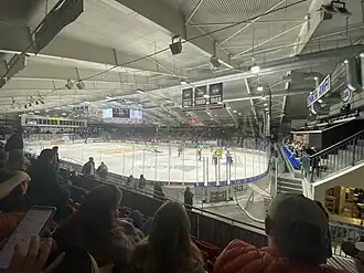 At first most of the venue had only standing room, giving a capacity for 6,000. Seats were offered only in two sections. This was later increased to five, allowing 1,600 seated spectators, but reducing the overall capacity to 4,000. By 1990 the club considered the need for a second ice surface. Various proposals were designed, and the club settled on a prospect whereby a new arena was built next to the existing structure. At first the southern end was proposed, but complaints from neighbors resulted in the eastern end being selected. The second rink, named Hafslund Ungdomshall ("Hafslund Youth Hall"), was completed in January 2007.[1] The second rink was the thirty-fourth indoor ice rink in Norway.[2] The upgrade also saw the installation of luxury suites in the main arena, as well as a new cafeteria and various sports facilities for Sparta, new locker rooms and an area for players to meet the press.[1] This gave a configuration for 1,572 seated and 2,135 standing spectators, for a total of 3,707.[2]