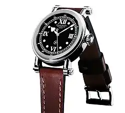 The first timepiece to bear the Speake-Marin name was a hand-made tourbillon pocket watch, called the Foundation Watch because it formed a template for future Speake-Marin watches[12] through the spade-shaped hands and pleated crown, watchmaker’s topping-tool motif, (here in the shape of the tourbillon cage) and hand-engraving.[13]