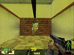 In the training mode, the player practices shooting at posters of prominent Israeli political and military figures (including the prime minister Ariel Sharon, defence minister Shaul Mofaz, and former prime minister Ehud Barak) to obtain points.[1][8][9] Upon completing the game, the player is virtually awarded a medal and a certificate from Hezbollah leader Hassan Nasrallah, as well as shown some Hezbollah fighters, described as martyrs, that were killed during the conflict.[1][9] The game is playable in Arabic, English, French, and Farsi.[1][10]