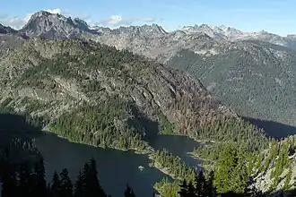 Spectacle Lake is an alpine freshwater lake located on the northern skirt of Chikamin Peak and Lemah Mountain in Kittitas County on its western border with King County, Washington. Because of its proximity to surrounding peaks and mountains at the heart of the Alpine Lakes Wilderness, the lake is a popular area for hiking, camping and fishing cutthroat trout.[1] Other Alpine lakes are in the vicinity, including the Chikamin Lake, a short distance North, at the base of Chikamin Peak. To the South is Hibox Mountain.