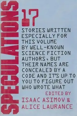 Speculations is an anthology of 17 short science fiction stories published by Houghton Mifflin in 1982. It was edited by Isaac Asimov and Alice Laurance. Instead of crediting the authors in the usual manner, it encouraged readers to guess who wrote which story, and provided a code which could be broken to give the answers.