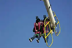 The ride is primarily a 37-metre arm, connected midway to the main support of the ride. Two sets of two seats are mounted at the end of each arm, back to back. Each four-seat assembly can swing through 360 degrees.[1]