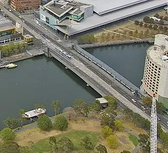 During construction engineers knew deep foundations would be required to find bedrock but, at 20 metres below sea level, they struck a red gum stump that took three weeks work to remove. It was dated at about 8,000 years old and appeared to have lived for well over 400 years.[13] The cantilever girder type, with steel girder suspended span bridge was completed in 1930,[2][14] with an adjacent glass and steel covered footbridge built alongside in 1998, as part of the Melbourne Convention & Exhibition Centre.[15][16][17][18][19]