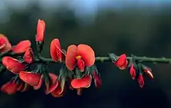 Sphaerolobium grandiflorum is an erect, slender shrub that typically grows to a height of 0.3–1 m (1 ft 0 in – 3 ft 3 in) and is leafless. The flowers are usually arranged in pairs in leaf axils with scale-like bracts at the base. The sepals are about 6.5 mm (0.26 in) long and joined at the base for half their length. The flowers are red, yellow and orange, the standard petal broad, about twice as long as the sepals, and deeply notched, the wings much shorter than the standard and the keel longer than the wings. Flowering occurs from September to November and the fruit is a pod that is slightly broader than long.[2][3]