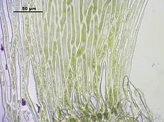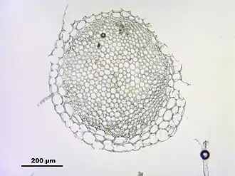 The stem itself is relatively slender, measuring 0.4–0.8 mm (0.02–0.03 in) in diameter (rarely up to 1.0 mm).[7] The stem colour ranges from pale green to straw-coloured.[8] Inside, it has a central cylinder that appears green to brownish-green, made up of thin-walled cells that become smaller and thicker toward the edges.[2] This is surrounded by a well-developed but fragile outer layer (hyalodermis) composed of 2–3 layers of transparent (hyaline) cells. These outer cells typically feature large pores, usually one per cell,[7] with each pore situated in the distal portion of the cell free from the cell wall.[8]
