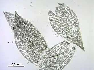 Branch leaves measure 1.1–2.2 mm in length and are arranged irregularly around the branches rather than in distinct rows.[7] Each leaf has a lance-like shape with slightly curved edges and an inrolled tip (involute apex).[8] The leaves' cellular structure shows regular patterns of strengthening fibers and has many small holes (pores) where cells meet (commissures).[2] The pores show a distinctive pattern: on the convex surface, they grade from small near the leaf apex to large at the base, while the concave surface features large round pores at the leaf apex and along the margins.[8] They contain specialised cells for water storage (hyaline cells) that vary in size, being smaller near the tip (60–90 by 15–20 μm) and larger towards the base (up to 170 by 30–40 μm).[7]