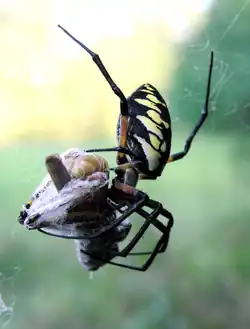Like other arachnids, spiders are unable to chew their food, so they have a mouth part shaped like a short drinking straw that they use to suck up the liquefied insides of their prey. However, they are able to eat their own silk to recycle proteins needed in the production of new spider webs.[4] Some spiders, such as the dewdrop spiders (Argyrodes), even eat the silk of other spider species.[5]