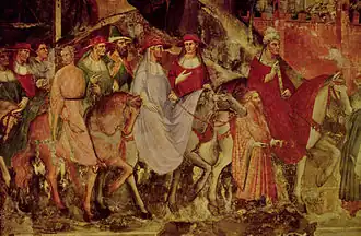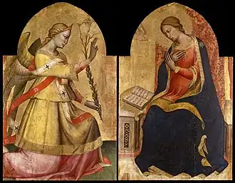 In the past it was believed that Spinello was a pupil of Jacopo del Casentino, a follower of Giotto. However, this is no longer accepted by art historians.[5] Spinello's style was a sort of link between the school of Giotto and that of Siena. In the early part of his life he worked in Florence as an assistant to his master Jacopo while painting frescoes in the church of the Carmine and in Santa Maria Novella. Between 1360 and 1384 he was occupied in painting many frescoes in and near Arezzo, almost all of which have now perished.[6]