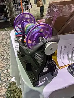 An electric spinning wheels, or e-spinner, is powered by an electric motor rather than via a treadle. Some require mains power while others may be powered by a low-voltage source, such as a rechargeable battery. Most e-spinners are smaller, more portable, and quieter than treadle wheels. One of the attractions of an e-spinner is that it is not necessary to coordinate treadling with handling the fibre (drafting), so it can be easier to learn to spin on an e-spinner than a traditional treadle-style spinning wheel. E-spinners are also suitable for spinners who have trouble treadling or keeping their treadling speed consistent.[31]