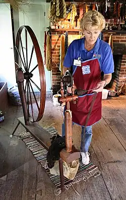 Spinning wool on a great wheel at a demonstration in the Conner Prairie living history museum loom house