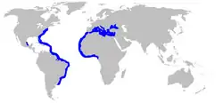 This species has a patchy and discontinuous distribution in Atlantic tropical and warm-temperate waters. In the western Atlantic it is found from Massachusetts, United States to Buenos Aires Province, Argentina; it is rare in the Gulf of Mexico and common in the mouths of tidal creeks along the Virginia coast. In the eastern Atlantic, it is found from Portugal to Angola, including Madeira and the Canary Islands.[1] It is also recorded in the Mediterranean and Black Seas.[2] It is found in shallow brackish and coastal waters over soft sandy or muddy substrates, at a depth of 5–100 m (16–328 ft).[3] This ray is uncommon overall but can be locally abundant in suitable habitat.[1] Individuals may segregate by sex, with females usually staying in deeper water but moving inshore to breed.[4]