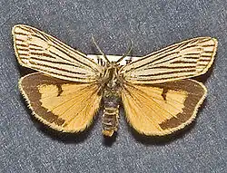 This very distinctive moth has a wingspan of 30–35 millimetres (1.2–1.4 in). Forewings are usually yellow or light yellow, with narrow longitudinal dark brown stripes in males, while in females the striations may be missing or restricted to the outer parts. Also hindwings are yellow, but they are darker and much wider than forewings and show a dark brown edge. The antennae of the males are pinnate. The caterpillars are hairy and black, with bright spots on the sides and a reddish-brown stripe on the back. The moths are diurnal and they fly May to August depending on the location.