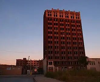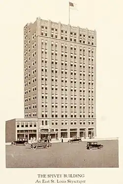 The Spivey Building is a 12-story skyscraper located at 417 Missouri Avenue in East St. Louis, Illinois. Built in 1927 by newspaper owner Allen Spivey, the building is the only skyscraper ever constructed in East St. Louis. Architect Albert B. Frankel designed the building in the Commercial style. The building's design features terra cotta spandrels separating its windows vertically and brick pier dividing its window bays. The asymmetrical entrance is surrounded by decorative marble piers, and the first two stories are separated from the rest of the building by a cornice and sill. The top of the building features a two-story parapet with terra cotta surrounds at each window and seven capitals at its peak, of which only five remain fully intact. During the height of East St. Louis' prosperity through the 1950s, the building housed the offices of professionals in many fields who were considered among the best in the city. However, the building became a victim of the city's steep economic decline and has been abandoned for several decades.[2] The building’s last tenant moved out around 1980.