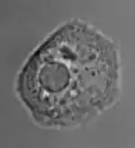 Paramecium and Amoeba possess large contractile vacuoles (average diameter of 13 and 45 μm, respectively), which are relatively comfortable to isolate, manipulate and assay. The smallest known contractile vacuoles belong to Chlamydomonas, with a diameter of 1.5 μm. In Paramecium, which has one of the most complex contractile vacuoles, the vacuole is surrounded by several canals, which absorb water by osmosis from the cytoplasm. After the canals fill with water, the water is pumped into the vacuole. When the vacuole is full, it expels the water through a pore in the cytoplasm which can be opened and closed.[2] Other protists, such as Amoeba, have CVs that move to the surface of the cell when full and undergo exocytosis. In Amoeba contractile vacuoles collect excretory waste, such as ammonia, from the intracellular fluid by both diffusion and active transport.