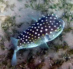 Cyclichthys spilostylus, known commonly as the spotbase burrfish or yellowspotted burrfish, is a species of marine fish in the family Diodontidae.